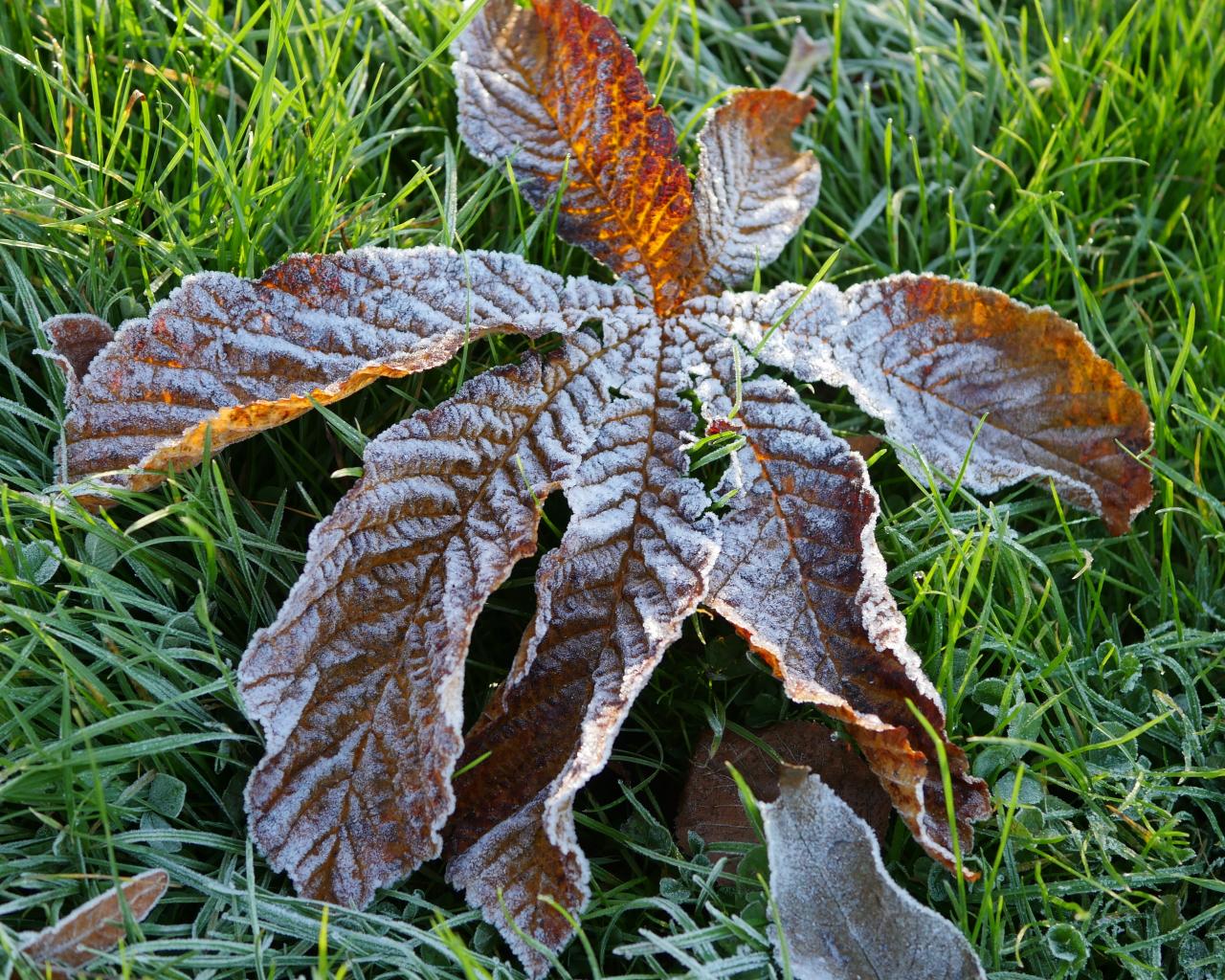 Обои Сухой лист покрытый инеем лежит на зеленой траве