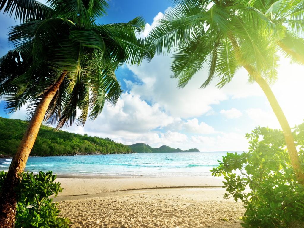 Обои Высокие зеленые пальмы на берегу океана