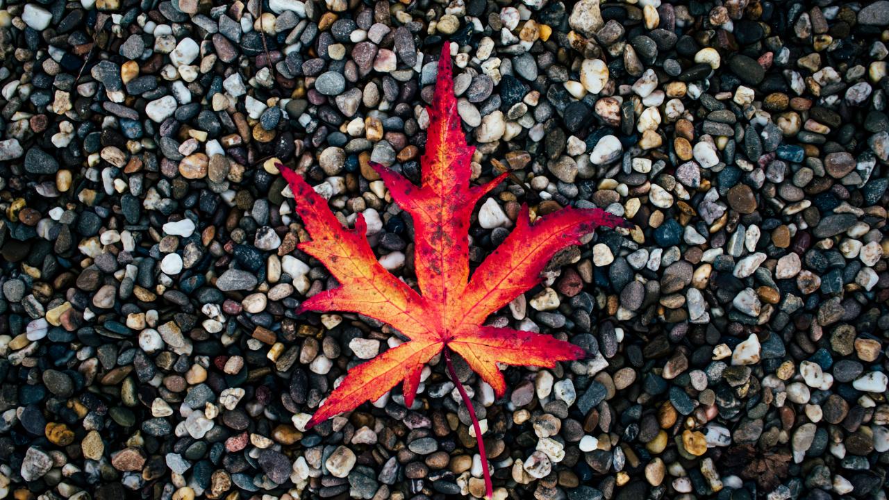 Обои Опавший желтый лист лежит на мелких камнях
