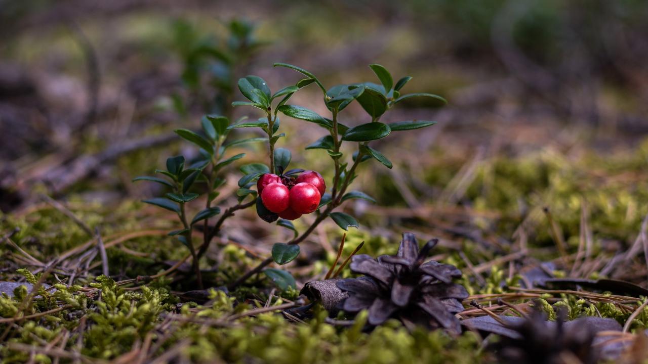 Обои Красные ягоды клюквы на траве с сухими опавшими сосновыми шишками