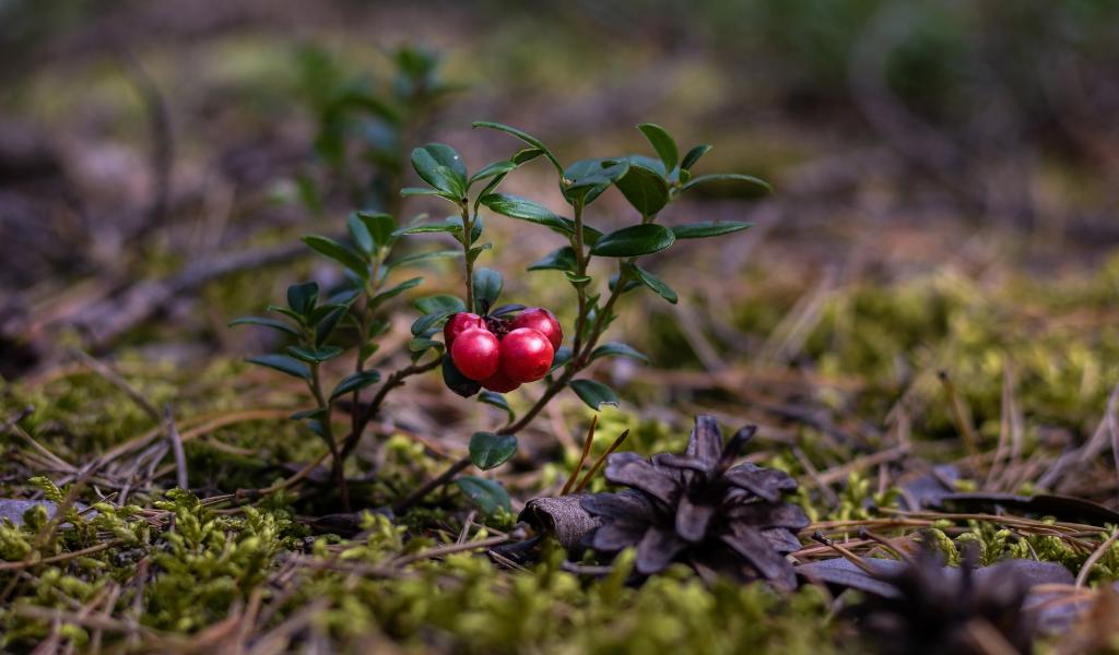 Обои Красные ягоды клюквы на траве с сухими опавшими сосновыми шишками