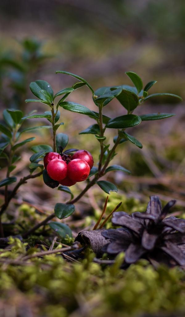 Обои Красные ягоды клюквы на траве с сухими опавшими сосновыми шишками