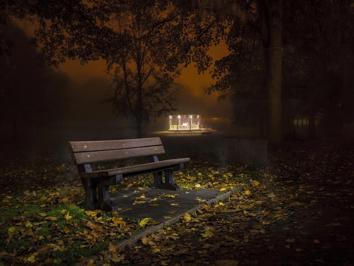 Обои Одинокая скамейка в осеннем парке ночью