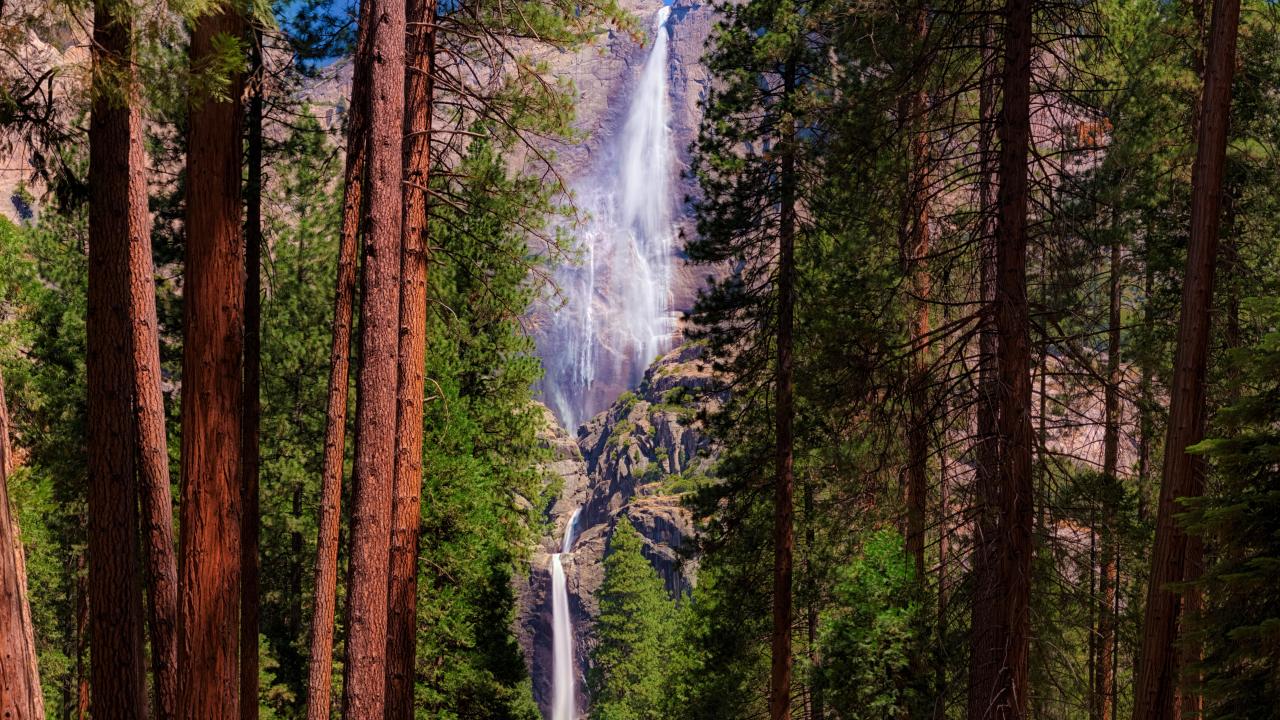 Обои Высокие зеленые сосны на фоне утеса с водопадом