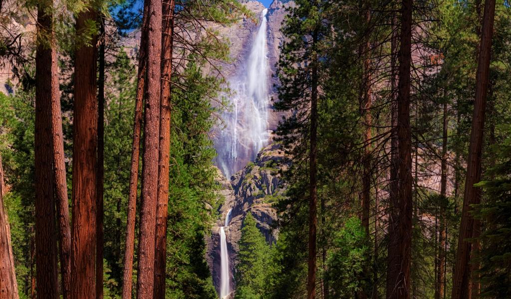 Обои Высокие зеленые сосны на фоне утеса с водопадом