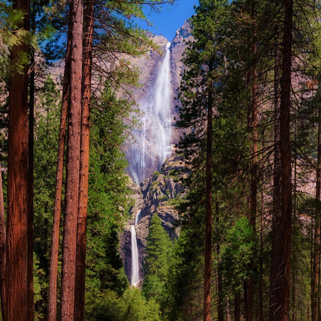 Обои Высокие зеленые сосны на фоне утеса с водопадом