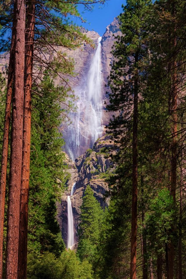 Обои Высокие зеленые сосны на фоне утеса с водопадом