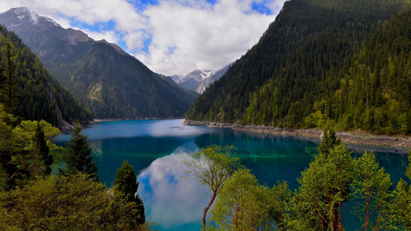 Обои Красивое озеро у покрытых лесом гор в парке Цзючжайгоу, Китай