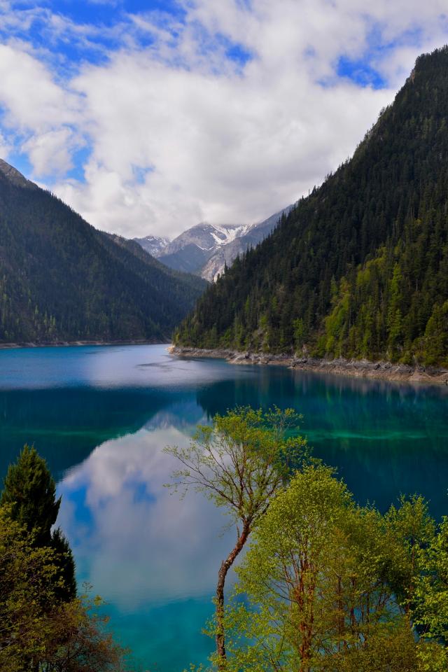 Обои Красивое озеро у покрытых лесом гор в парке Цзючжайгоу, Китай