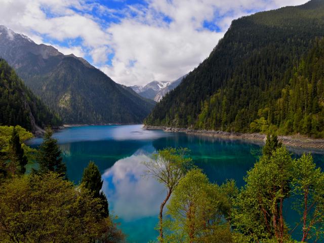 Обои Красивое озеро у покрытых лесом гор в парке Цзючжайгоу, Китай