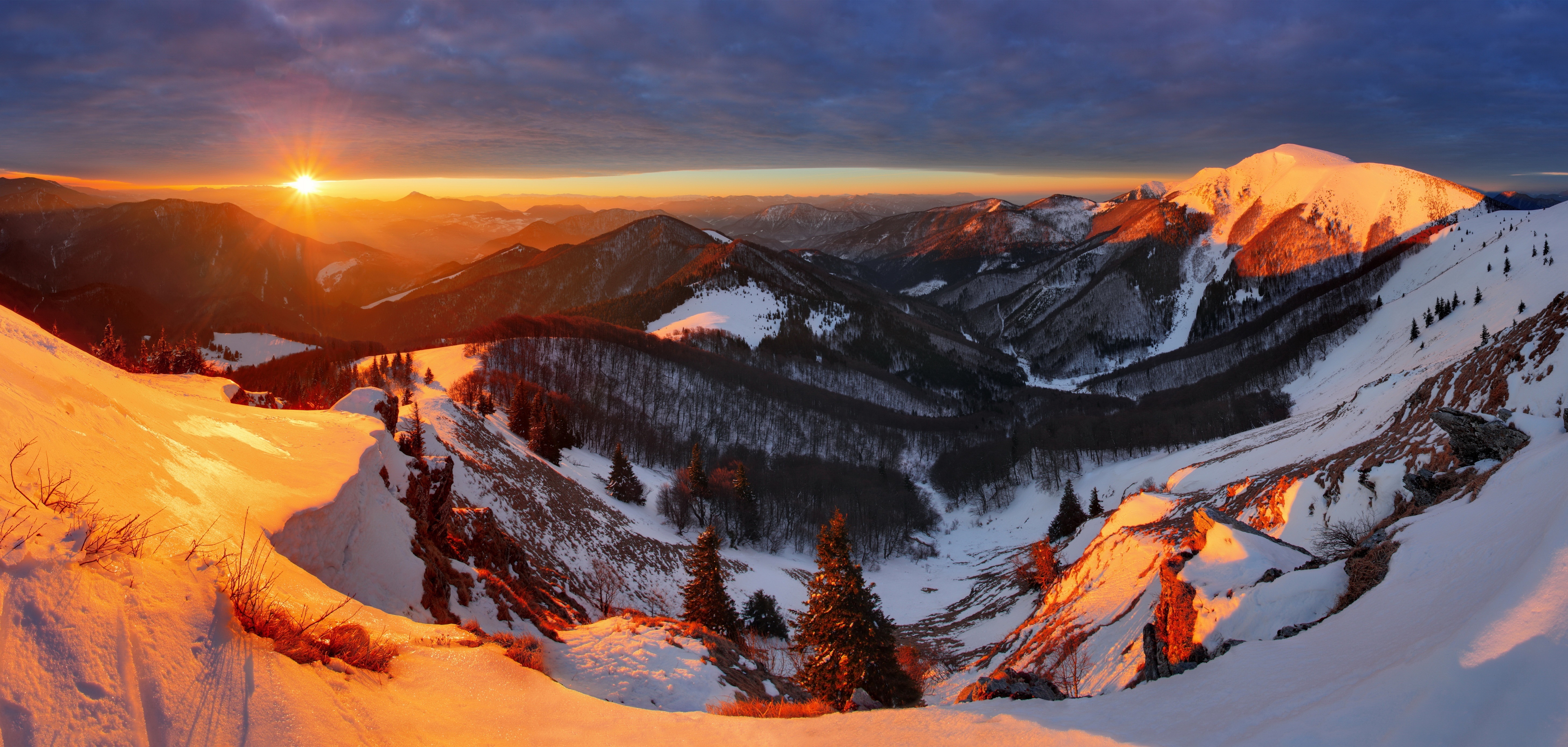 Обои Заснеженные горы, покрытые деревьями в лучах солнца на закате