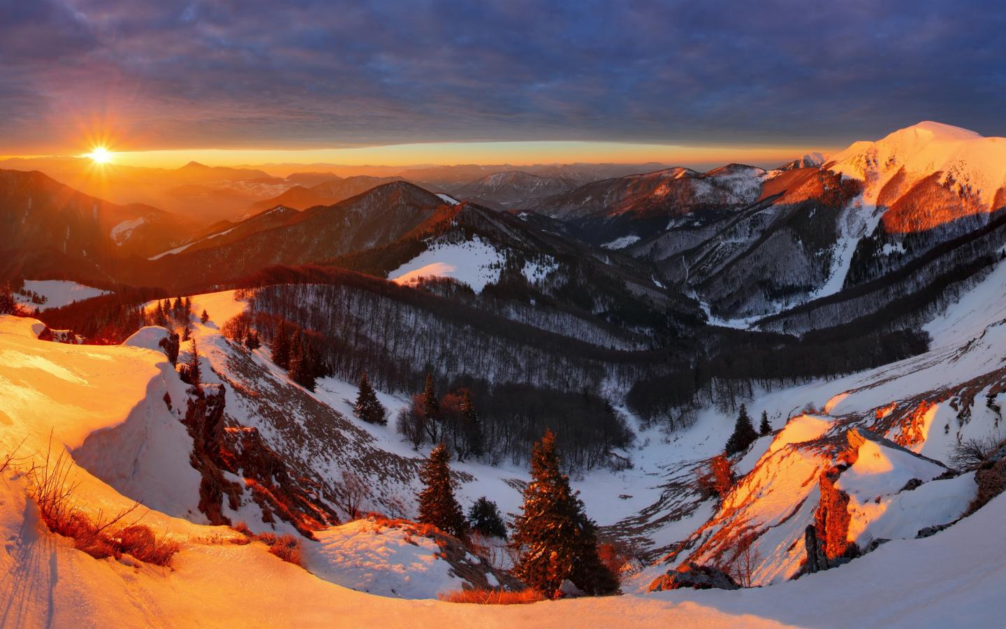 Обои Заснеженные горы, покрытые деревьями в лучах солнца на закате