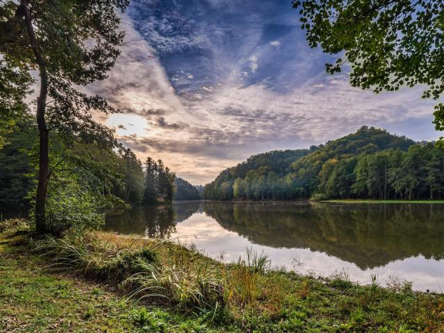 Обои Зеленые деревья на берегу реки под красивым небом