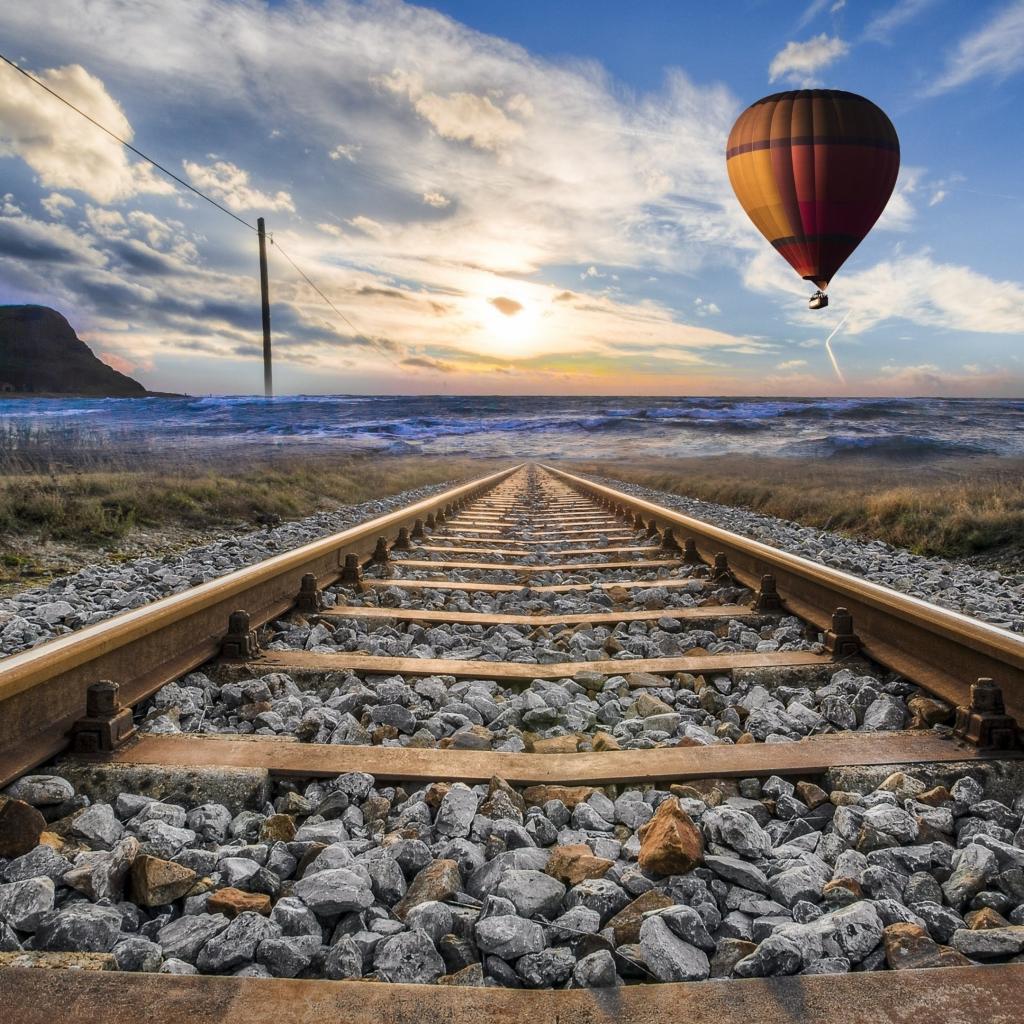 Обои Воздушный шар в красивом голубом небе над железной дорогой