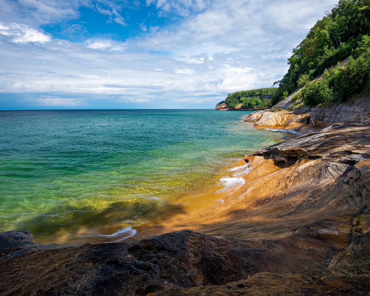Обои Скалистый берег у голубой воды моря на фоне неба