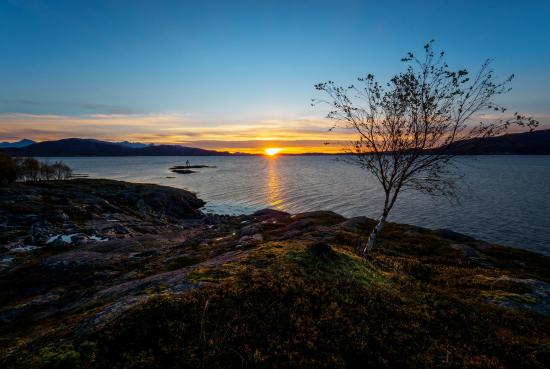 Обои Тонкая береза на скалистом берегу моря на закате под голубым небом