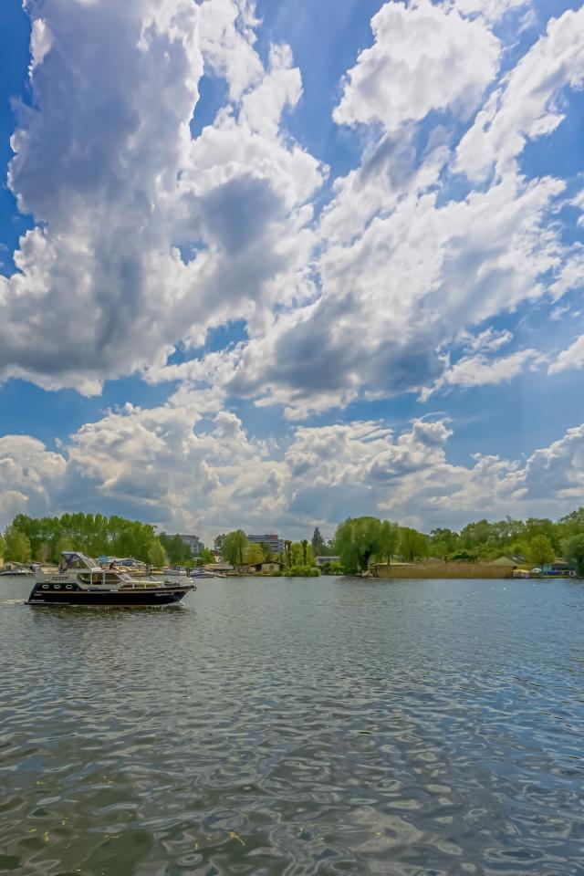 Обои Катер на озере под красивым голубым небом с белыми облаками
