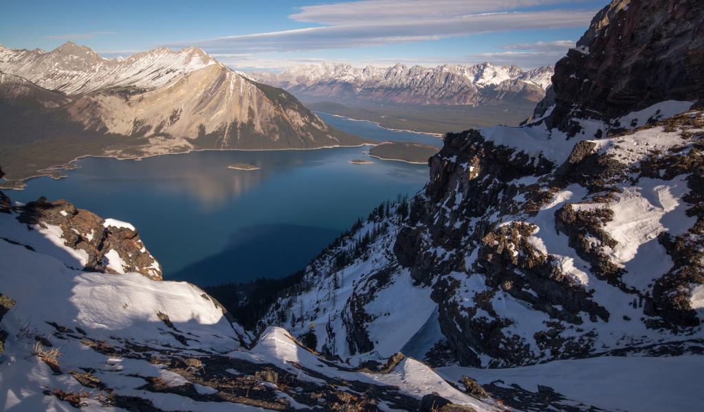 Обои Озеро между заснеженных гор на фоне голубого неба