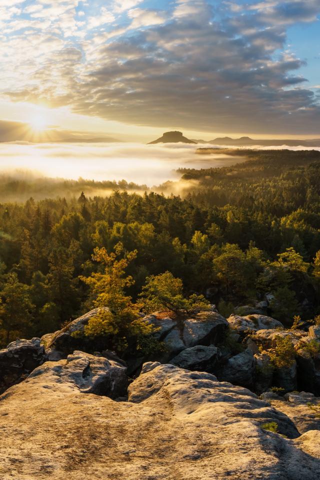 Обои Вид со скалы на покрытый туманом лес и озеро на восходе солнца