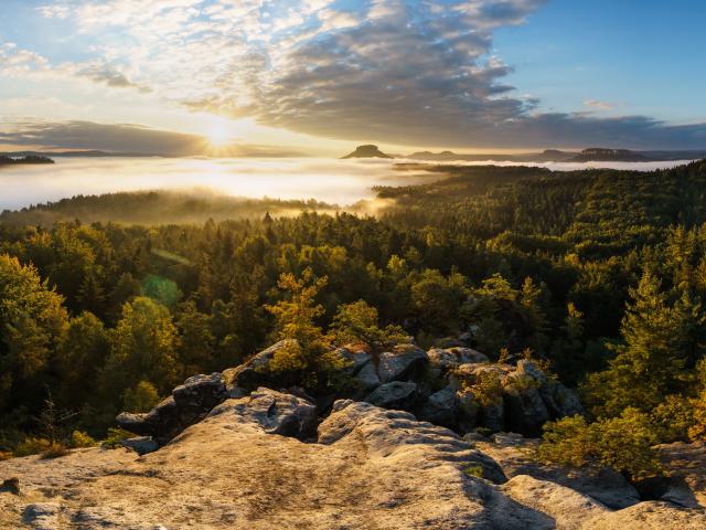 Обои Вид со скалы на покрытый туманом лес и озеро на восходе солнца