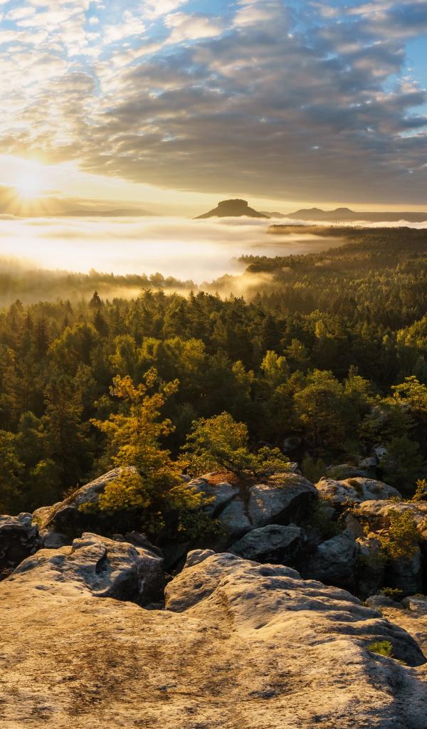 Обои Вид со скалы на покрытый туманом лес и озеро на восходе солнца