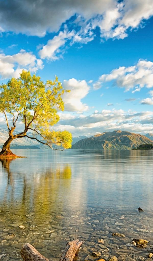 Обои Дерево посреди озера под красивым небом с белыми облаками