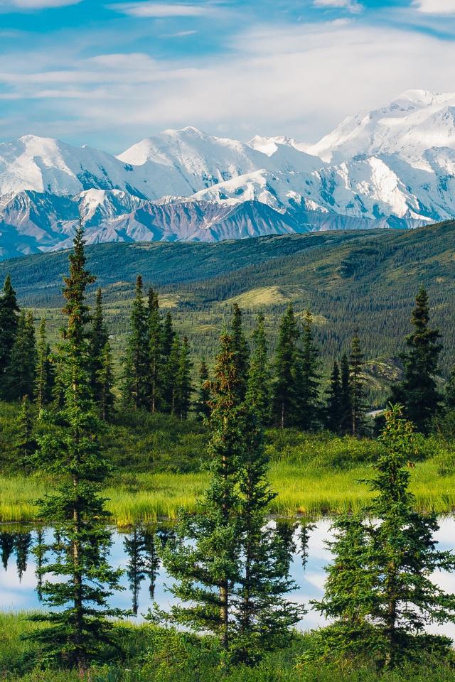 Обои Красивый вид на горы, лес и озеро, Аляска