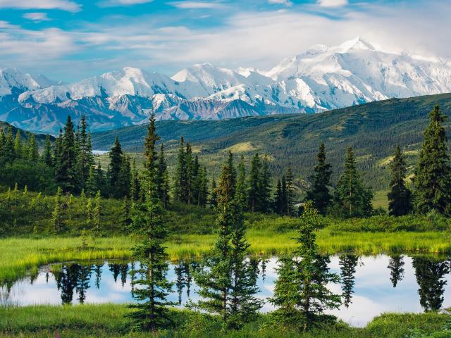 Обои Красивый вид на горы, лес и озеро, Аляска