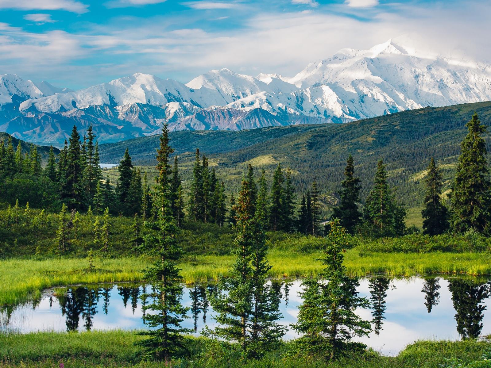 Обои Красивый вид на горы, лес и озеро, Аляска