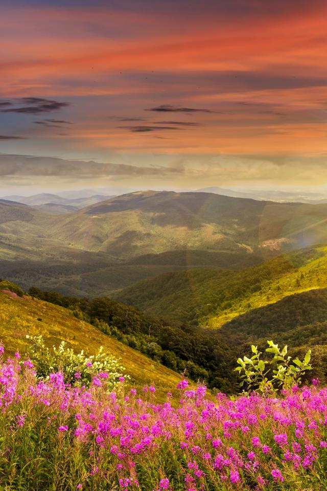 Обои Рассвет яркого летнего солнца над холмами с розовыми цветами