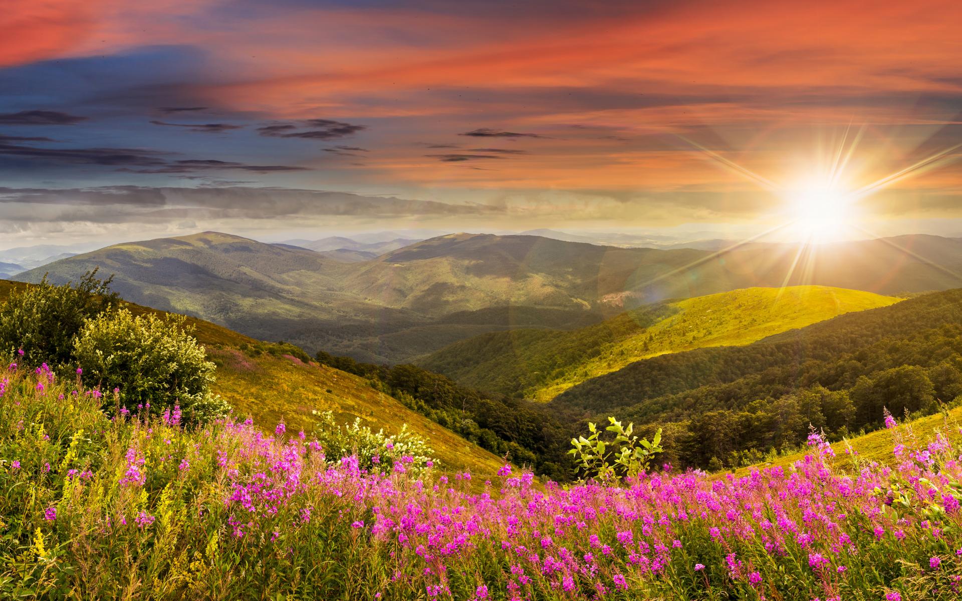 Обои Рассвет яркого летнего солнца над холмами с розовыми цветами