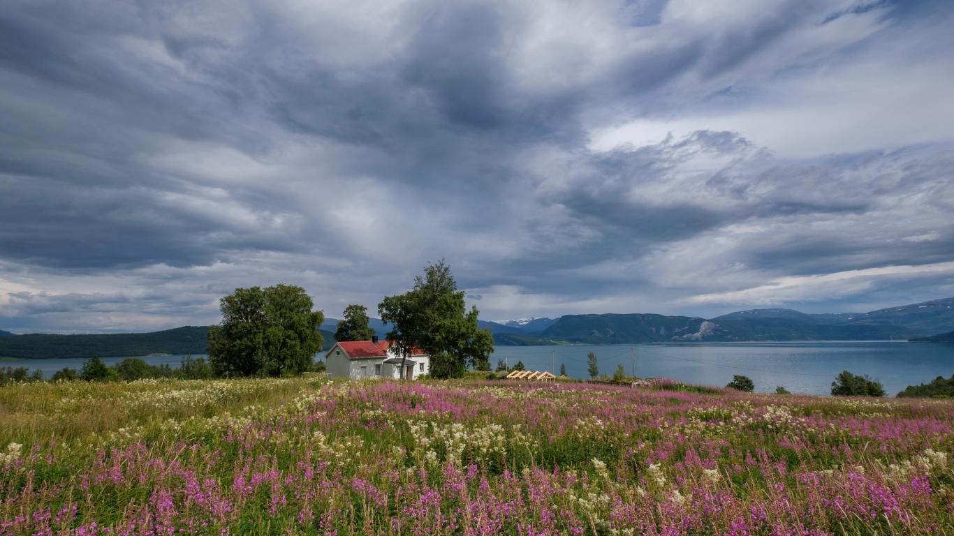 Обои Пасмурное небо над озером и полем с красивыми цветами
