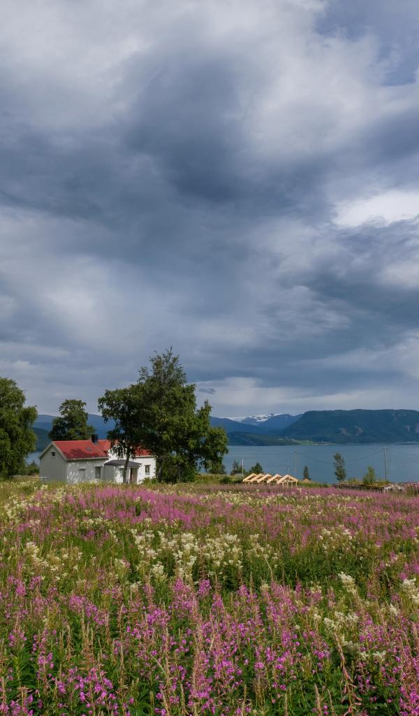 Обои Пасмурное небо над озером и полем с красивыми цветами