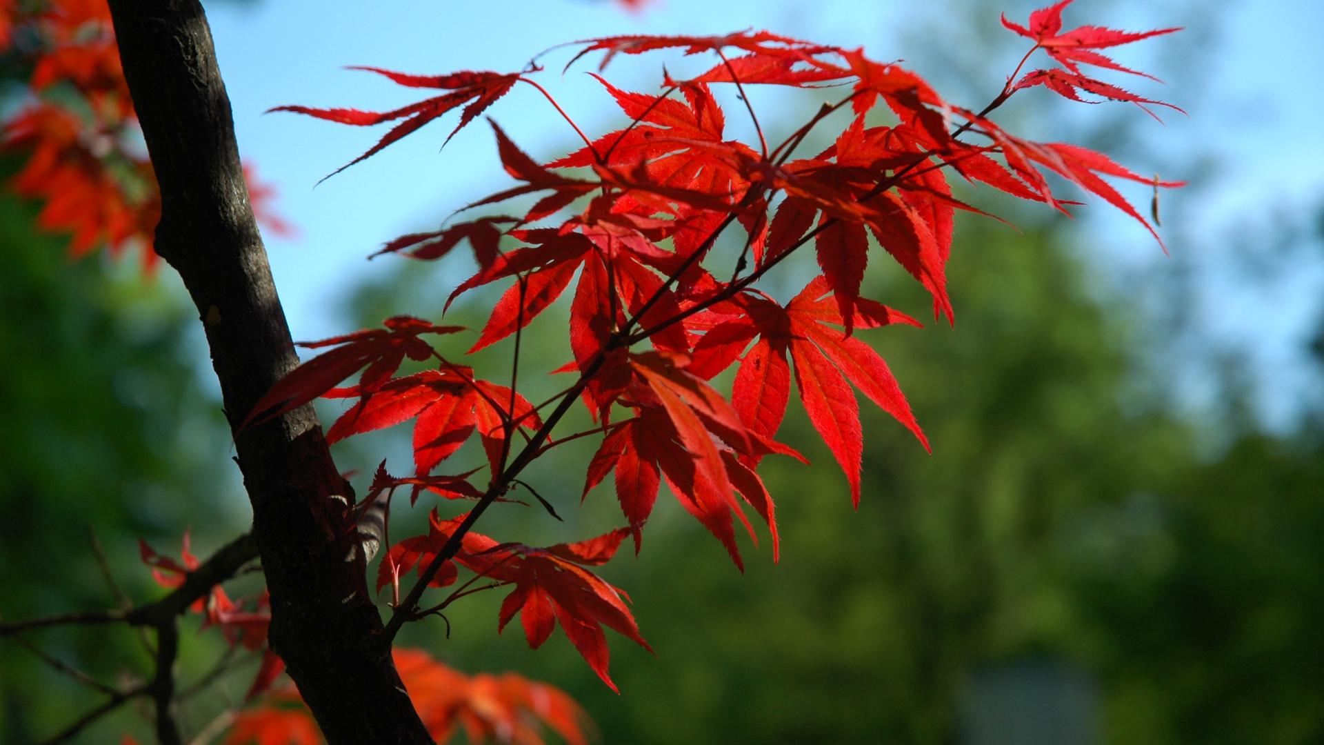 Обои Ветка с красными листьями на дереве