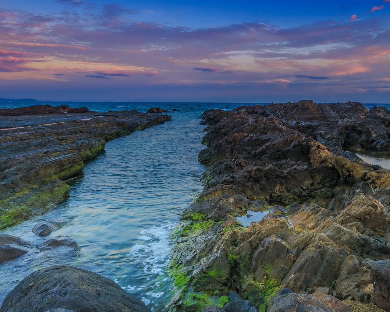 Обои Покрытые мхом камни в морском заливе