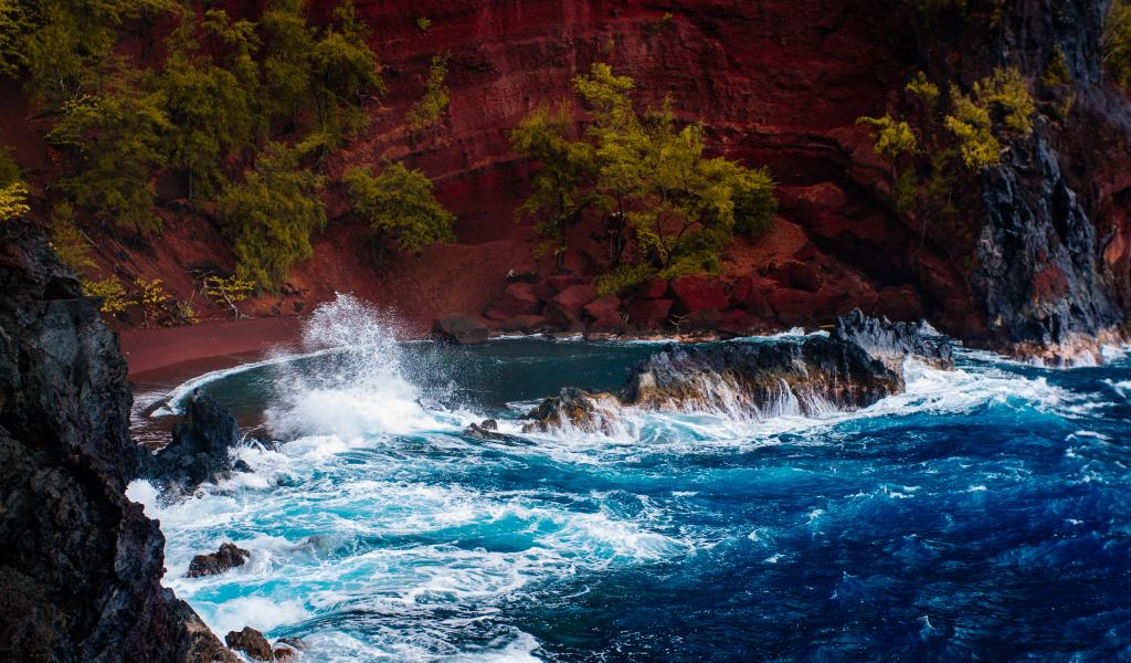 Обои Грубое море брызгает камнями перед красным песчаным океанским заливом в Хане