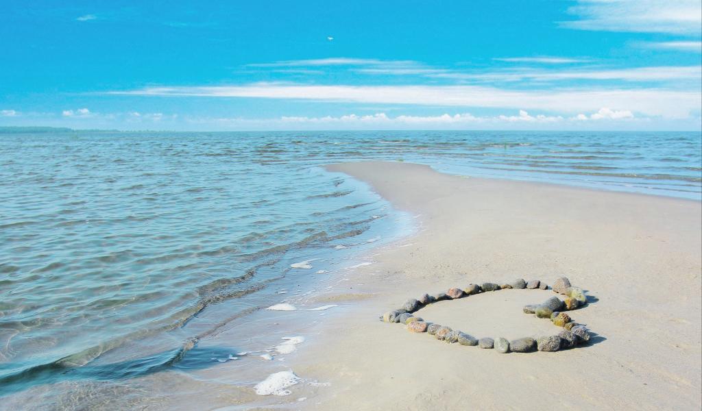 Обои Сердце из камней на песке у спокойного моря под голубым небом