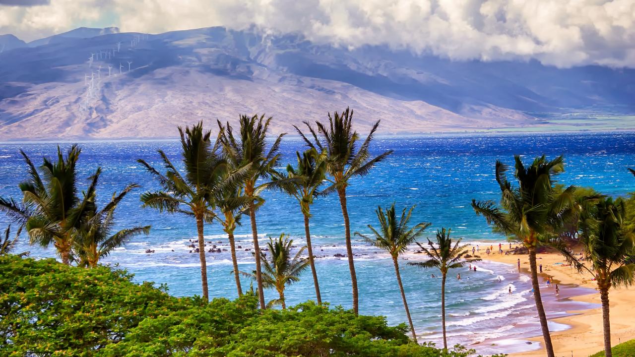 Обои Зеленые пальмы на пляже у океана на фоне гор
