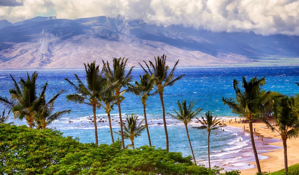 Обои Зеленые пальмы на пляже у океана на фоне гор