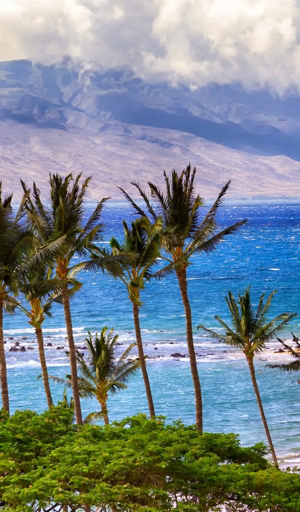 Обои Зеленые пальмы на пляже у океана на фоне гор