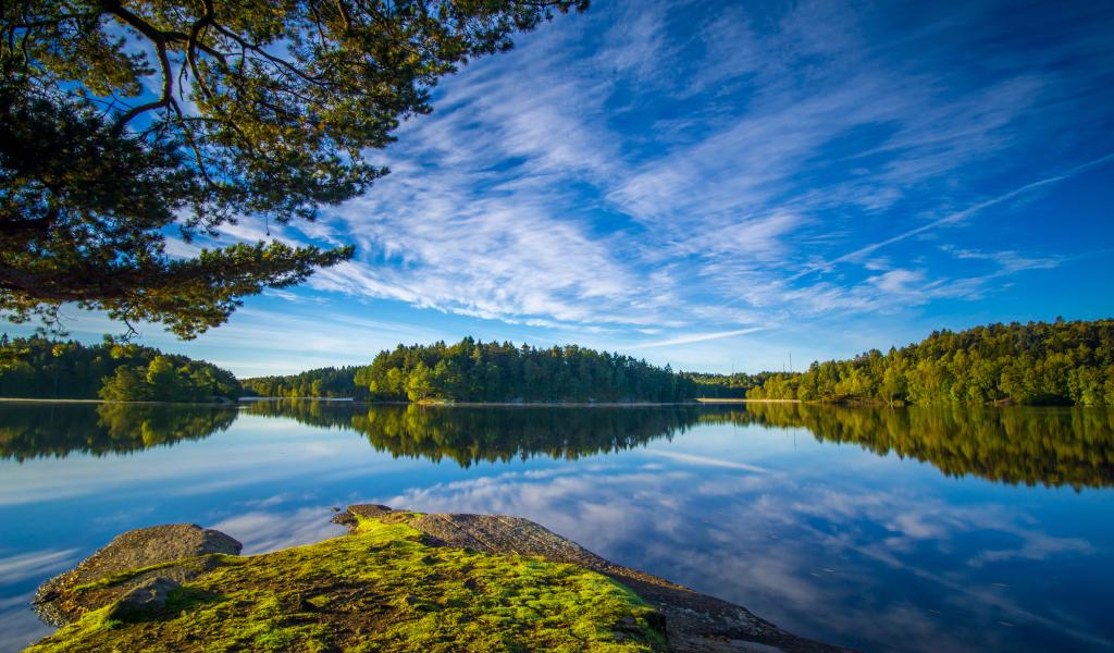 Обои Голубое небо и зеленые деревья отражаются в воде