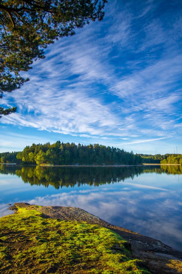Обои Голубое небо и зеленые деревья отражаются в воде