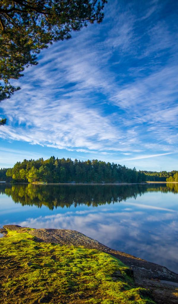 Обои Голубое небо и зеленые деревья отражаются в воде