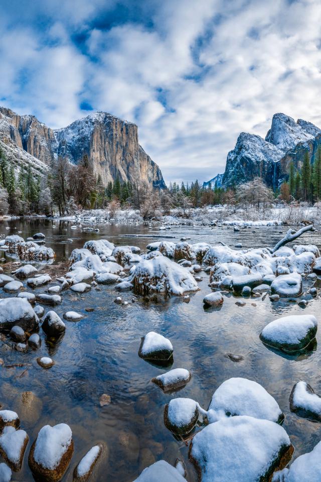 Обои Река с покрытыми снегом камнями, Йосемитский Национальный Парк, Калифорния. США