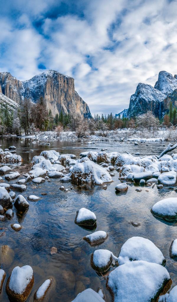 Обои Река с покрытыми снегом камнями, Йосемитский Национальный Парк, Калифорния. США