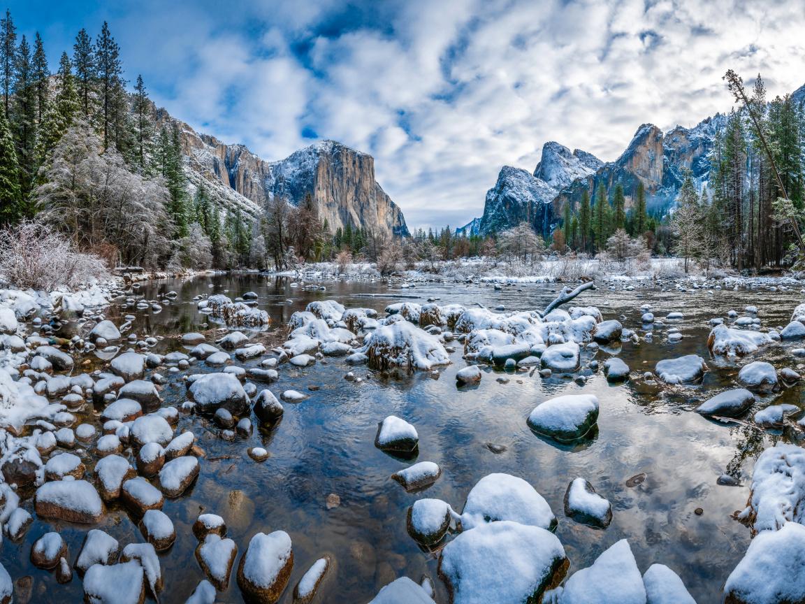 Обои Река с покрытыми снегом камнями, Йосемитский Национальный Парк, Калифорния. США