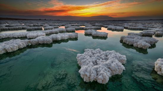 Обои Соляные отложения в воде под красивым небом на закате