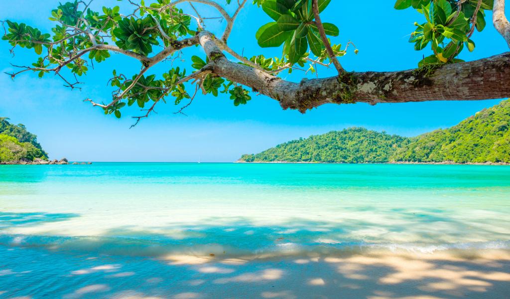 Обои Ветка дерева на тропическом пляже у голубого океана