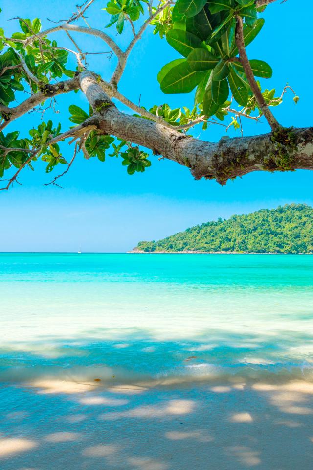 Обои Ветка дерева на тропическом пляже у голубого океана