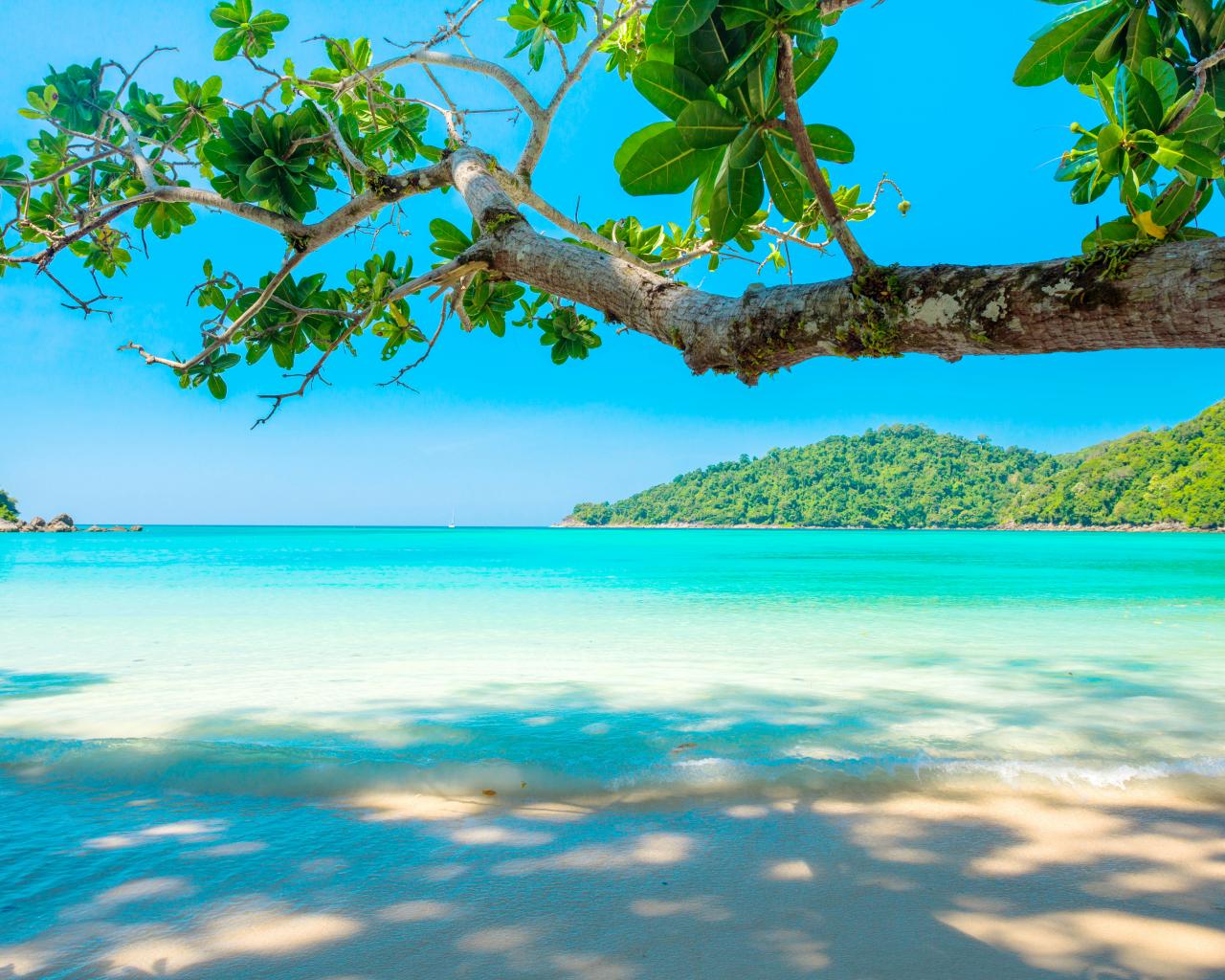 Обои Ветка дерева на тропическом пляже у голубого океана